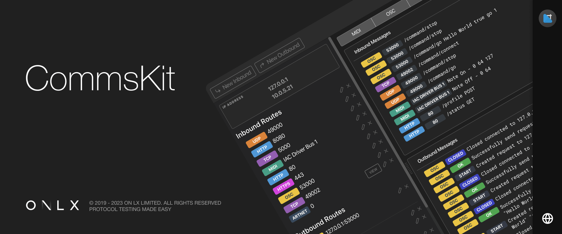 Welcome to CommsKit, a protocol testing application for macOS and Windows designed for the entertainment and installation industries. CommsKit brings testing and monitoring of MIDI, OSC, HTTP, UDP, TCP, Art-Net & sACN protocols into a single intuitive application.