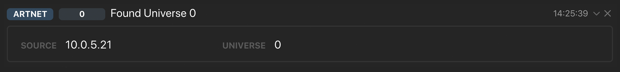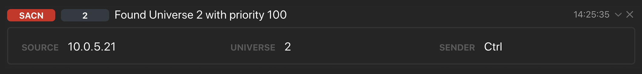 sACN items display either a Found or Lost message for the defined universe. The priority of the active data will additionally be shown. The expanded view includes the source IP, universe and sender name.