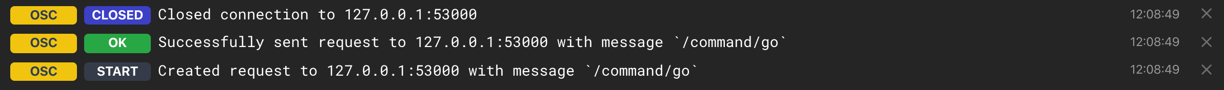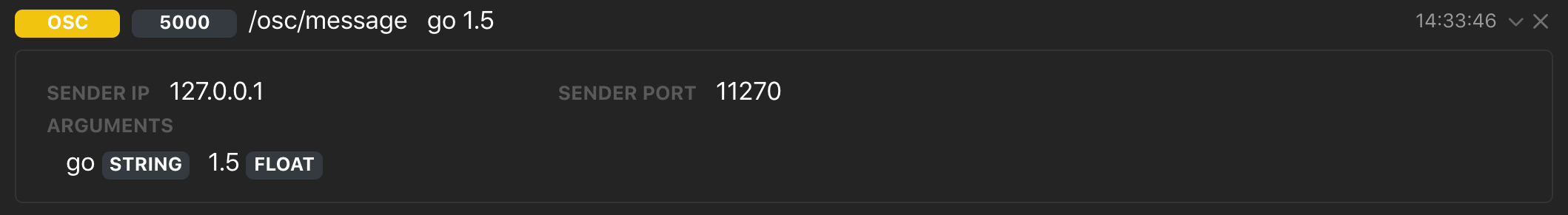 OSC items display the port and message with arguments. The expanded view includes the sender IP, port and a breakdown of the arguments with their format type.