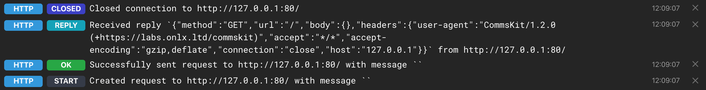 All data received by CommsKit is displayed in the top Inbound Messages log view and gives an overview of all commands received by CommsKit. The Outbound Messages log view toward the bottom half of the interface provides a monitoring overview of all outgoing actions.