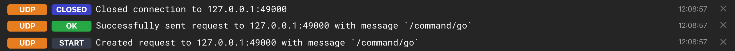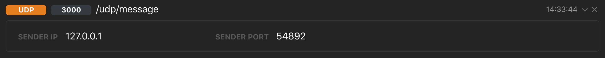 UDP items display the port and message. The expanded view includes the sender IP and port.
