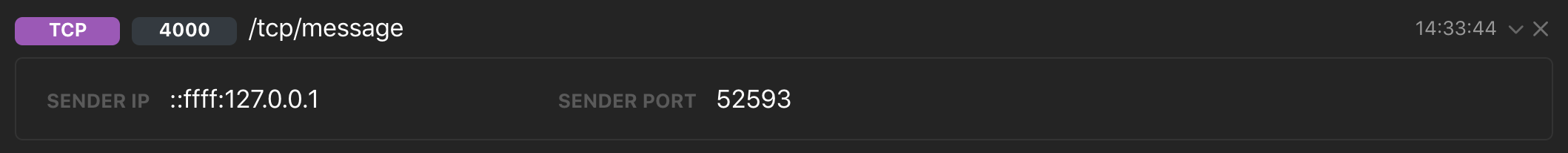 TCP items display the port and message. The expanded view includes the sender IP and port.